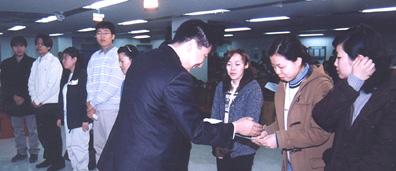 Á¤¹®½Ä Áý»ç, 10¸íÀÇ ´ëÇнÅÀÔ»ý¿¡°Ô ¼ö¿©¡°´ëÇп¡¼ ½Å¾ÓÀÎÀ¸·Î ºû°ú ¼Ò±ÝµÇ¶ó¡± ´çºÎ Áö³ 9ÀÏ °íµî3ºÎ ÁÖÀÏ¿¹¹è ½Ã°£¿¡´Â Ưº° ÀåÇÐ±Ý ½Ã»óÀÇ ½Ã°£ÀÌ ¸¶·ÃµÅ ¶ß°Å¿î ¹Ú¼ö¿Í °¨µ¿ÀÌ .... ¤Ó2003-03-15