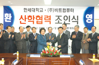 °³±³ 50ÁÖ³âÀ» ¸Â´Â ÇѼ¼´ëÇб³(ÃÑÀå ±è¼ºÇý)´Â IT»ç°üÇб³·Î ºÒ¸®´Â (ÁÖ)ºñÆ®ÄÄÇ»ÅÍ(´ëÇ¥ÀÌ»ç Á¶ÇöÁ¤)¿Í Áö³ 20ÀÏ º»°ü8Ãþ ȸÀǽǿ¡¼ »êÇÐÇù·ÂÁ¶ÀνÄÀ» °ÅÇàÇß´Ù.À̳¯ Çù¾à½Ä¿¡ Âü.... ¤Ó2003-02-21