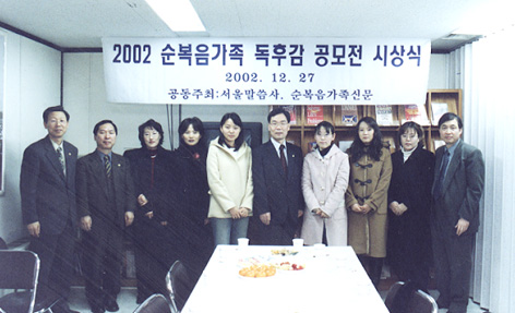 ¼¿ï¸»¾¸»ç¿Í ¼øº¹À½°¡Á·½Å¹®»ç°¡ °øµ¿ ÁÖÃÖÇÑ ¡®2002 ¼øº¹À½°¡Á· µ¶Èݨ °ø¸ðÀü¡¯ ½Ã»ó½ÄÀÌ ±¸¶ø 27ÀÏ ¼øº¹À½°¡Á·½Å¹®»ç¿¡¼ ½Ç½ÃµÆ´Ù.À̳¯ ½Ã»ó½Ä¿¡¼ ÃÖ¿ì.... ¤Ó2003-01-03