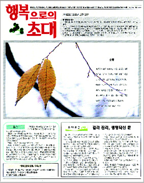 1¸éÀº ·Î°í°¡ °¡Àå Å« º¯È. ´ëºÎºÐÀÇ ¼ºµµµéÀÌ ÀüµµÇÒ ¶§ ½Å¹®À» 4ºÐÀÇ 1·Î Á¢´Â °Í¿¡ Âø¾È, ÀÏ´Ü Á¢Àº ½Å¹®À» ¹ÞÀº ºÒ½ÅÀÚµéÀÌ Èï¹Ì¸¦ ´À³¥ ¼ö ÀÖ´Â ÆíÁý±âȹ¿¡ ÁýÁßÇß´Ù. ÇູÀ¸·ÎÀÇ ÃÊ´ë ·Î°í¿Í ´©±¸³ª ½±°Ô ÀÐÀ» ¼ö ÀÖ´Â ¸í¾ðÀÌ ÁÖ¿ä³»¿ë. ÆîÃÆÀ» ¶§´Â ÇູÇÑ ½Ã¼±À» ÁÖÁ¦·Î ÂïÀº »çÁø ¡®Çູ°¶·¯¸®¡¯¿Í ±âµ¶±³ÀÎÀ¸·Î¼ »çȸ¿¡¼ Àú¸íÀλç·Î Ȱµ¿ÇÏ´Â À̵éÀÇ ±ÛÀ» ½ÇÀº ¡®ÇູÇâ±â¡¯, ¡®±ÝÁÖÀÇ Àá¾ð¡¯ µîÀÌ Àд ÀÌÀÇ ¼ÕÀ» °è¼Ó Àâ°Ô µÈ´Ù. ±âÁ¸ µÎ¸é¿¡ °ÔÀçµÈ ¼³±³´Â ÇѸ鿡 ¿ä¾à Á¤¸®µÈ´Ù. ¹Ù»Û Çö´ëÀεéÀÌ ½±°Ô ÀÐÀ» ¼ö ÀÖµµ·Ï ¡®Á¶¿ë±â ¸ñ»çÀÇ ÁÖÀϼ³±³¡¯°¡ 2¸é¿¡, ¿ì¸®±³È¸ ¼ºµµµéÀÇ °£Áõ°ú °¢Á¾ ¾È³»°¡ 3¸éÀ» Â÷ÁöÇÑ´Ù. 4¸éÀº ±âÁ¸ÀÇ ¡®¿Ö ¿¹¼ö´ÔÀ» ¹Ï¾î¾ß Çϳª¡¯°¡ °è¼ÓµÇ¸ç Çö´ëÀεéÀÇ °í¹ÎÀ» ¼Ó½Ã¿øÈ÷ ¾Ë·ÁÁÙ »ó´ã°ú ±âµ¶¸¸ÆòÀÌ ½Å¼³µÈ´Ù.