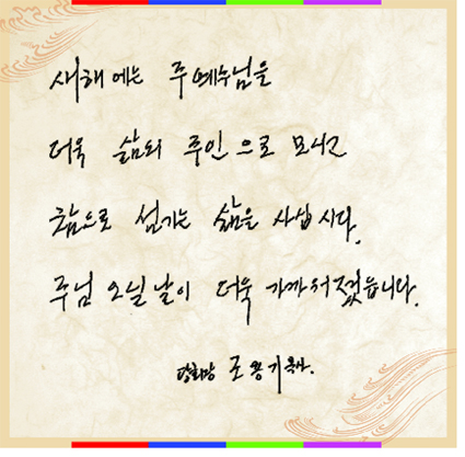 ¡°2004³âÀº °ÅÁþ°ú ºÎÁ¤ÀÌ »ç¶óÁ® Çϳª´ÔÀÇ °øÀǰ¡ Çϼöó·³ Èê·¯³ª°í, ³²ºÏ À庮ÀÌ ¹«³ÊÁ® Æò¾ç¿¡ Á¦2ÀÇ ¿©Àǵµ¼øº¹À½±³È¸°¡ ¼¼¿öÁüÀ¸·Î ¹ÎÁ·º¹À½ÈÀÇ Ãʼ®ÀÌ µÉ ¼ö ÀÖµµ·Ï, ¼º·É¿îµ¿ÀÇ ³î¶ó¿î ¿ª»ç·Î ¿ÀÁߺ¹À½°ú »ïÁßÃູÀÇ ÀºÇý°¡ ±³È¸¿¡ ³ÑÃij¯ ¼ö ÀÖµµ·Ï, ÁÖ´Ô ¿À½Ç ¶§±îÁö Àü¼¼°è º¹À½È¸¦ À§ÇÑ ÇàÁøÀÌ À̾îÁú ¼ö ÀÖµµ·Ï ±âµµÇÏÀÚ¡±´Â ±èź¹ ¸ñ»çÀÇ ¸àÆ®¿¡ ¼ºµµµéÀº Èñ¸ÁÂù »õÇØ¸¦ ±â´ëÇϸç ÇѸ¶À½À¸·Î ±âµµÇß´Ù.