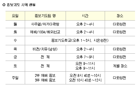¼øº¹À½¿µ¼ºÈƷÿøÀº Áߺ¸±âµµ¸ðÀÓÀ» Ȱ¼ºÈÇÏ¿© ¼ºµµµéÀÇ ±âµµ »ýȰÀ» Àû±Ø ±ÇÀåÇÑ´Ù. °³ÀÎÀÇ ±âµµ´Â ¹°·Ð ±³È¸ÀÇ »ç¿ª°ú ±¹°¡¸¦ À§ÇÑ Àϰö °³ÀÇ Áߺ¸±âµµ¸ðÀÓÀº Çü¼ºÇÏ°í ±³È¸³» ±âµµÀÇ ºÒÀ» ÀÕ°í ÀÖ´Ù.