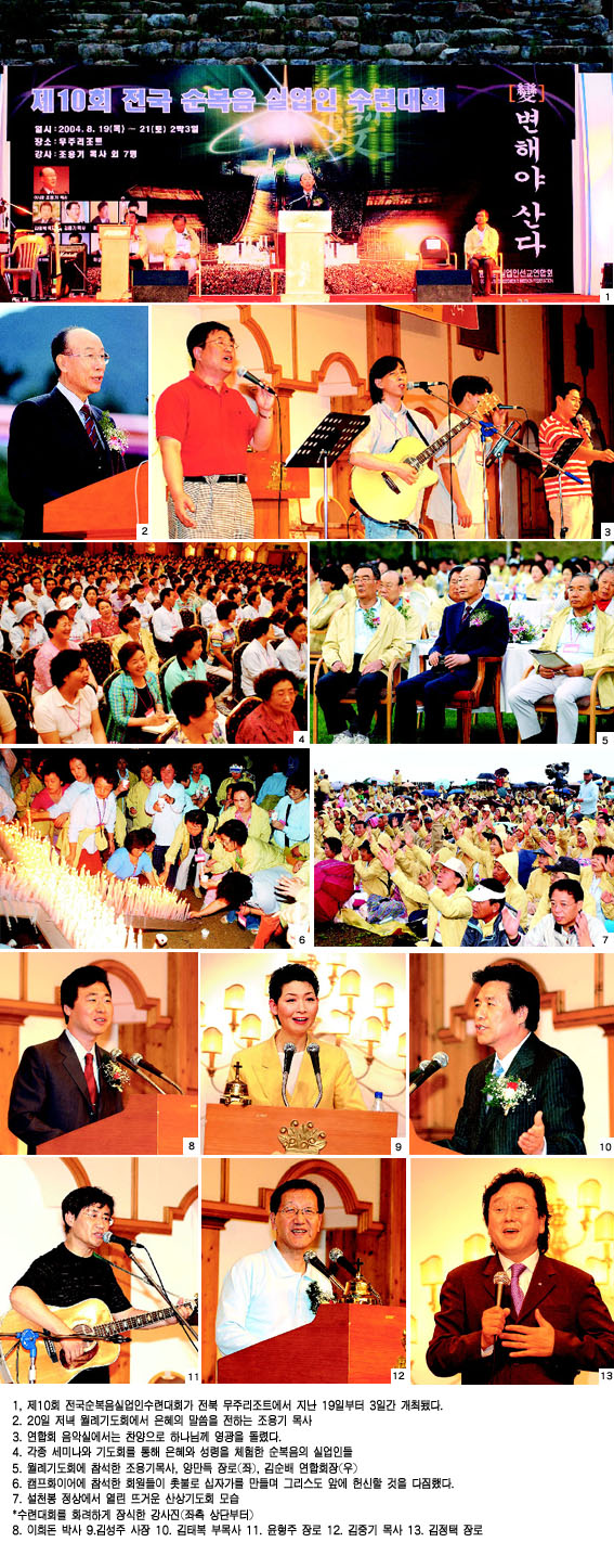 ¡Û¡¦´«À¸·Î ºÁµµ 180µµ ¹Ù²î¾î ±â¸³¹Ú¼ö(?)¸¦ ¹ÞÀº ¼ö·Ã´ëȸ ¾È³»Ã¥ÀÚºÎÅÍ ½ÃÀÛÇØ 10ÁÖ³âÀ» ¸Â¾Æ °ú°¨ÇÑ º¯È¸¦ ½ÃµµÇÑ ¼¼¹Ì³ª ÇÁ·Î±×·¥°ú °»çÁø, ¼Ò¸®¾øÀÌ ¿òÁ÷ÀÎ 200¿© ¸íÀÇ º»ºÎ ³» Çå½ÅÀÚµéÀÇ È°¾à, ±×¸®°í 10³â µ¿¾È ¼ö·Ã´ëȸ¿¡ ¾ÖÁ¤À» °®°í Âü¼®Çؿ ȸ¿øµé. ÀÌ ¸ðµç ¿ä¼ÒµéÀÌ ±×¸®½ºµµÀÇ »ç¶û¾È¿¡ ³ì¾ÆÁ® Á¦10ȸ Àü±¹¼øº¹À½½Ç¾÷Àμö·Ã´ëȸ¸¦ ¾Æ¸§´ä°Ô ¸¸µé¾ú´Ù.