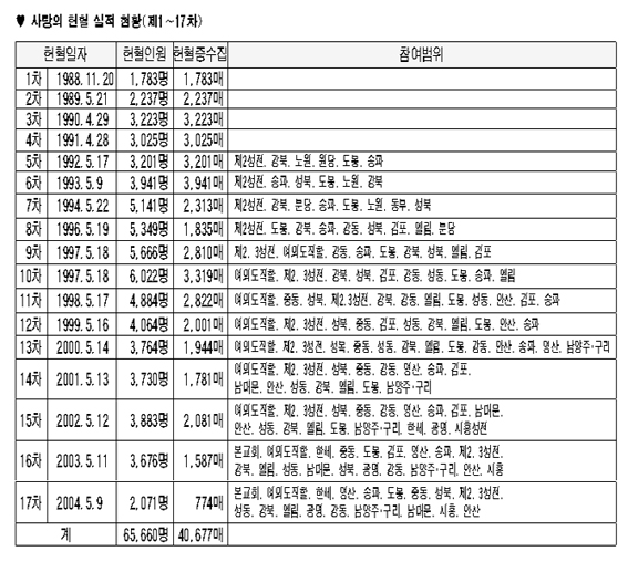 1988³â¿¡´Â ÇåÇ÷ÀÚ Àü¿øÀÌ ÇåÇ÷Áõ¼¸¦ ±³È¸¿¡ ±âÁõÇÏ¿´À¸¸ç, Áö±Ý±îÁö 4¸¸677ÀåÀÇ ÇåÇ÷Áõ¼°¡ ¸ð¾ÆÁ³´Ù. ¸ð¾ÆÁø ÇåÇ÷Áõ¼´Â ¾È¼öÁý»çȸ¿¡¼ º¸°üÇϸç, ¼öÇ÷ÀÌ ÇÊ¿äÇÑ À̵鿡°Ô ±âÁõÇϰí ÀÖ´Ù. ÇåÇ÷Áõ¼´Â ¿ì¸®±³È¸¼ºµµ»Ó ¾Æ´Ï¶ó Ãʱ³ÆÄÀûÀ¸·Î ÇÊ¿äÇÑ À̵鿡°Ô Áö±ÞÇÏ¿© ¿¹¼ö ±×¸®½ºµµÀÇ »ç¶ûÀ» ÀüÇϰí ÀÖ´Ù.