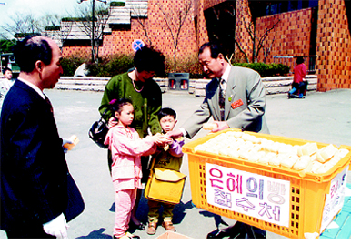 ´ë¼ºÀü µÚ ¡®ÀºÇýÀÇ »§¡¯ ¸íÆÐ°¡ ºÙ¾î ÀÖ´Â ÄÁÅ×ÀÌ³Ê ¹Ú½º ¾È¿¡ µé¾î°¡º¸¸é ÀºÇýÀÇ »§ ¼öÀü½Ç¿¡¼ ºÀ»çÇÏ´Â ¾È¼öÁý»çµéÀ» ¸¸³¯ ¼ö ÀÖ´Ù. ¸Å ÁÖ¸¶´Ù ¼ö°ÅµÈ ÀºÇýÀÇ »§À» ¼öÀüÇÏ´Â ¾È¼öÁý»çµéÀº °è¼ÓµÇ´Â ºÒ°æ±â¿¡µµ ¼ºµµµéÀÇ Âü¿©´Â À̾îÁö°í ÀÖÁö¸¸ ¿¹Àü¸¸Àº ¸øÇÏ´Ù°í ÀÔÀ» ¸ðÀº´Ù. ÀºÇýÀÇ »§ÀÌ Ã³À½ ½ÃÀÛ µÆ´ø ÃÊâ±â¿¡´Â ¹ã 12½Ã±îÁö ¼öÀüÇØ¾ßÇÒ ¸¸Å ¼ºµµµéÀÇ Âü¿©°¡ ¸¹¾Æ ÇÑ ÁÖ¿¡ µ¿Àü¸¸ 2000¸¸¿ø¾¿ ³ª¿À±âµµ Çß´Ù. Áö±ÝÀº ¸ÅÁÖ 380¸¸¿ø Á¤µµÀÇ µ¿ÀüÀÌ ¼ö°ÅµÇ´Â Á¤µµ´Ù. Áö³ 2003³â 10¿ùºÎÅÍ Áö±Ý±îÁö¸¦ »ìÆìº¸¸é 2¸¸5463°³ÀÇ »§ÀÌ ¸ð¿© 1¾ï7443¸¸1000¿øÀÌ ¸ð¿´´Ù.