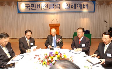 ±¹¹ÎºñÀüŬ·´ ¿ù·Êȸ°¡ Áö³ 4ÀÏ CCMMºôµù 12Ãþ ¿ìºÀȦ¿¡¼ ¿·È´Ù. Á¶¿ë±â ¸ñ»ç´Â °¥¶óµð¾Æ¼ 6Àå 7, 8ÀýÀ» ÁÖÁ¦·Î ½É°í °ÅµÎ´Â ¹ýÄ¢¿¡ ´ëÇØ ¼³±³ÇÏ¸ç ¡°¹ÏÀ½, ¼Ò¸Á, »ç¶û ±×¸®°í ¼º°æ ¸»¾¸À» ½ÉÀ¸¸é ±â»Ý°ú Ãູ, »õ »ý¸íÀ» °ÅµÎ°Ô µÈ´Ù¡±°í ¿ª¼³Çß´Ù. À̳¯ ¿¹¹è¿¡´Â ¼¿ïƯº°½ÃÀå À̸í¹Ú Àå·Î, ±¹È¸ÀÇ¿ø Ȳ¿ì¿© Àå·Î, À¯Àç°Ç Àå·Î°¡ Âü¼®ÇØ Àλ縻À» ÀüÇß´Ù. ¶ÇÇÑ µ¶ÀÚÈ®ÀåºÎ¹®, °¨»çÆÐ, ÃëÀçºÎ¹®, ǥâÆÐ µî ±¹¹ÎºñÀü»ó ½Ã»ó½ÄÀÌ À̾îÁ³´Ù. µ¶ÀÚÈ®ÀåºÎ¹®¿¡´Â Á¦3¼ºÀü, ³²¾çÁÖ¡¤±¸¸®¼ºÀü, ¿©ÀǵµÁ÷ÇÒ¼ºÀü, µ¿ÀÛ´ë±³±¸, ¾çõ´ë±³±¸°¡ ¼±Á¤µÆ°í °¨»çÆÐ´Â ³²¼±±³È¸ ȸÀå ÀåµÎÈ£ Àå·Î°¡ ¹Þ¾Ò´Ù. (¿ÞÂʺÎÅÍ Á¤±Ù¸ð ¸íÁö´ë ÃÑÀå, À̸í¹Ú ¼¿ï½ÃÀå, Á¶¿ë±â ¸ñ»ç, À¯Àç°Ç ±¹È¸Á¶Âù±âµµÈ¸Àå, ¹Ú¼ºÃ¶ ±¹¹ÎºñÀüŬ·´È¸Àå)