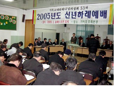 ±âÇϼº Áõ°æÃÑȸÀå°ú ÃÑȸ ÀÓ¿øµé, °¢ Áö¹æÈ¸ ÀÓ¿ø, °¢ ±¹Àå, °¢ À§¿øÈ¸ À§¿øÀåÀÌ Âü¼®ÇÑ °¡¿îµ¥ µå·ÁÁø À̳¯ ¿¹¹è¿¡¼ ÃÑȸÀå Á¤¿øÈñ ¸ñ»ç´Â ÀÌ»ç¾ß 60Àå 1Àý ¸»¾¸À» º»¹®À¸·Î ¼³±³Çß´Ù. Á¤ ÃÑȸÀåÀº ¡°2004³âÀº °æÁ¦ÀûÀ¸·Î³ª »çȸÀûÀ¸·Î ÂüÀ¸·Î ¾Ï¿ïÇßÁö¸¸, ¿ì¸®±³´Ü ³»ÀûÀ¸·Î´Â ÈÇÕ°ú ÀÏÄ¡¸¦ À§ÇØ ³ë·ÂÇÑ ÇØ¿´´Ù. ¶Ç ÃÖ¼º±Ô ¸ñ»ç°¡ ÇѱâÃÑ ´ëǥȸÀåÀ¸·Î ¼±ÃâµÇ¾î ±³´ÜÀûÀ¸·Î´Â ¿µ±¤½º·± ÇÑ ÇØ¿´´Ù¡±°í ÀüÇß´Ù. ¶Ç ¡°2005³âÀº °ú°Å¸¦ ¸ðµÎ ¾Ä¾î ¹ö¸®°í ¸ðµÎ°¡ ÇϳªµÇ¾î »õ·Î°Ô µµ¾àÇϱ⸦ ¹Ù¶õ´Ù¡±¸ç ¡°À̸¦ À§ÇØ ¸ÕÀú ²ÞÀ» °¡Áö°í ¼º·ÉÃæ¸¸À» À§ÇØ ±âµµÇÏÀÚ¡±°í ¸»Çß´Ù. ¾Æ¿ï·¯ Á¤ ÃÑȸÀåÀº 2005³â¿¡µµ ±³´Ü ÈÇÕ°ú ÀÏÄ¡¸¦ À§ÇØ ´õ¿í ³ë·ÂÇÒ °ÍÀ» ´ÙÁüÇß´Ù.